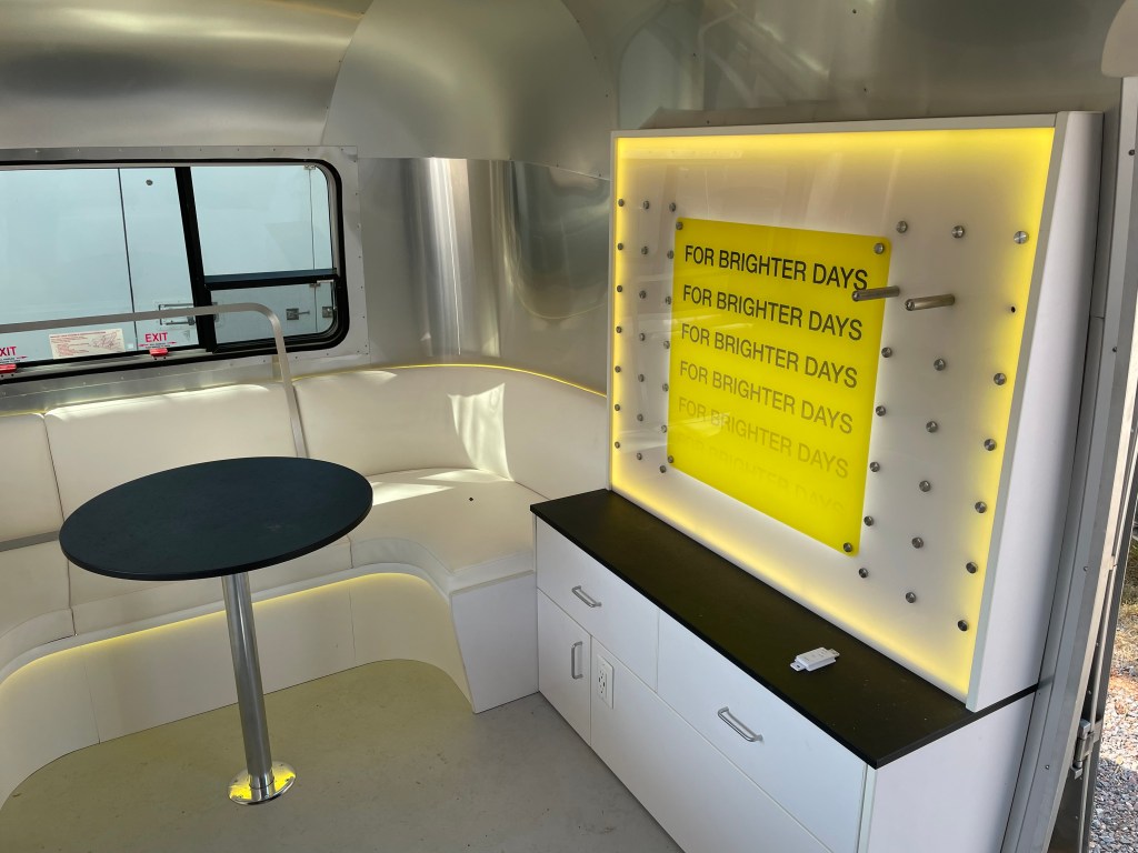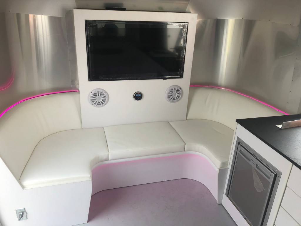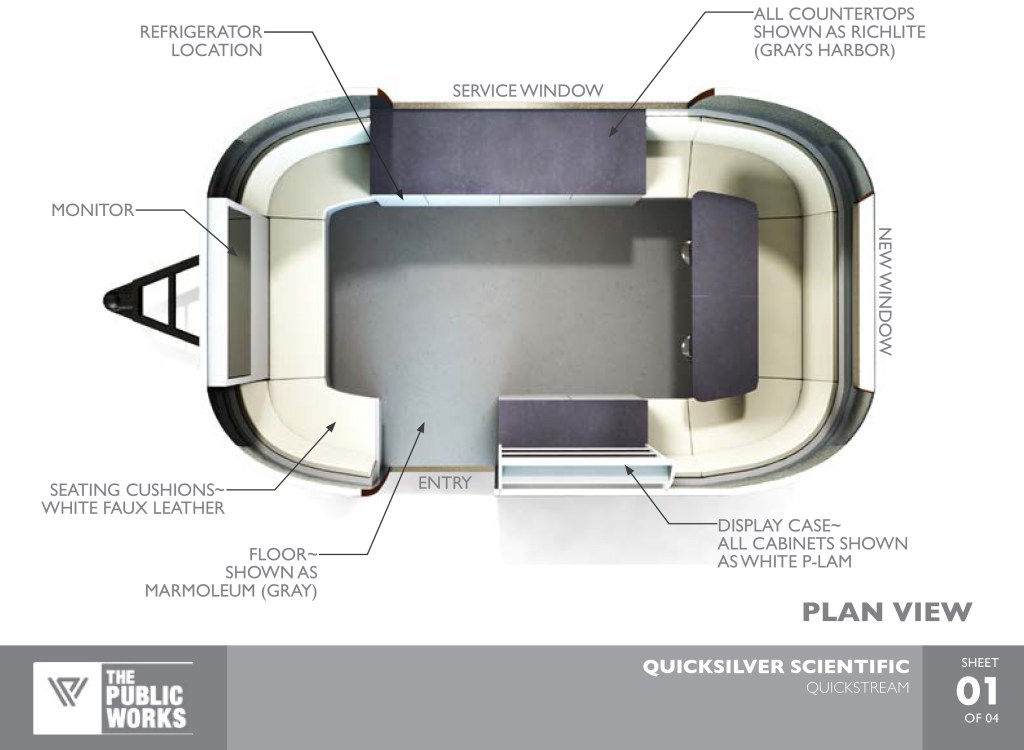 Quick and mobile was the idea. We sourced and built out an Airstream Bambi trailer to enable the team to grab product, hitch up the trailer and go! The build included a side service window and a full interior that could support luxurious meetings with clients, or be the centerpiece of a mobile activation. The interior featured curved, cushioned seating around the perimeter of the trailer, along with a product storage, refrigeration, custom lighting, branded display, a TV/monitor display and soundsystem. All of this was also made to be brand swappable – so we could quickly change signage and colors to represent sub brands like Aprico, or the parent brand Quicksilver Scientific.